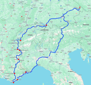 Tag 16 – Heimreise – Über den “Col de Brouis” nach Italien und dann auf Autobahnen über den Brenner zurück in den Bayerwald (1000 Km).