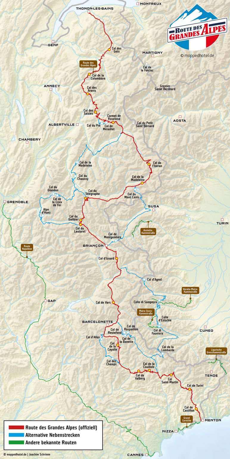 Die Route des Grandes Alpes zählt 21 Alpenpässe, die bis ans Mittelmeer zu bezwingen sind. Der Startpunkt ist in Thonon-les-Bains am Genfersee, Endpunkt der Route des Gandes Alpes ist Menton bei Nizza. Wir sind davon 14 Pässe gefahren, u.a. den 2770m hohen Col de Iseran (der höchste befahrbare Pass in den Alpen) und den Tour-de-France-Pass Col du Galibier (2645m). Nach etwa 2/3 der Route in den franz. Alpen sind wir in die Provence zur Verdonschlucht abgebogen und danach ging es noch weiter an die Côte d’Azur. Reisezeit von Freitag, 21. Juni bis Samstag, 06. Juli 2024 (16 Tage), Gesamtstrecke ca. 3100 Km. Übernachtet wurde meistens auf den in Frankreich zahlreichen Campingplätzen, die Preise für den Camper, 2 Personen und Strom betrugen zwischen 20,- und 40,- EUR pro Nacht.